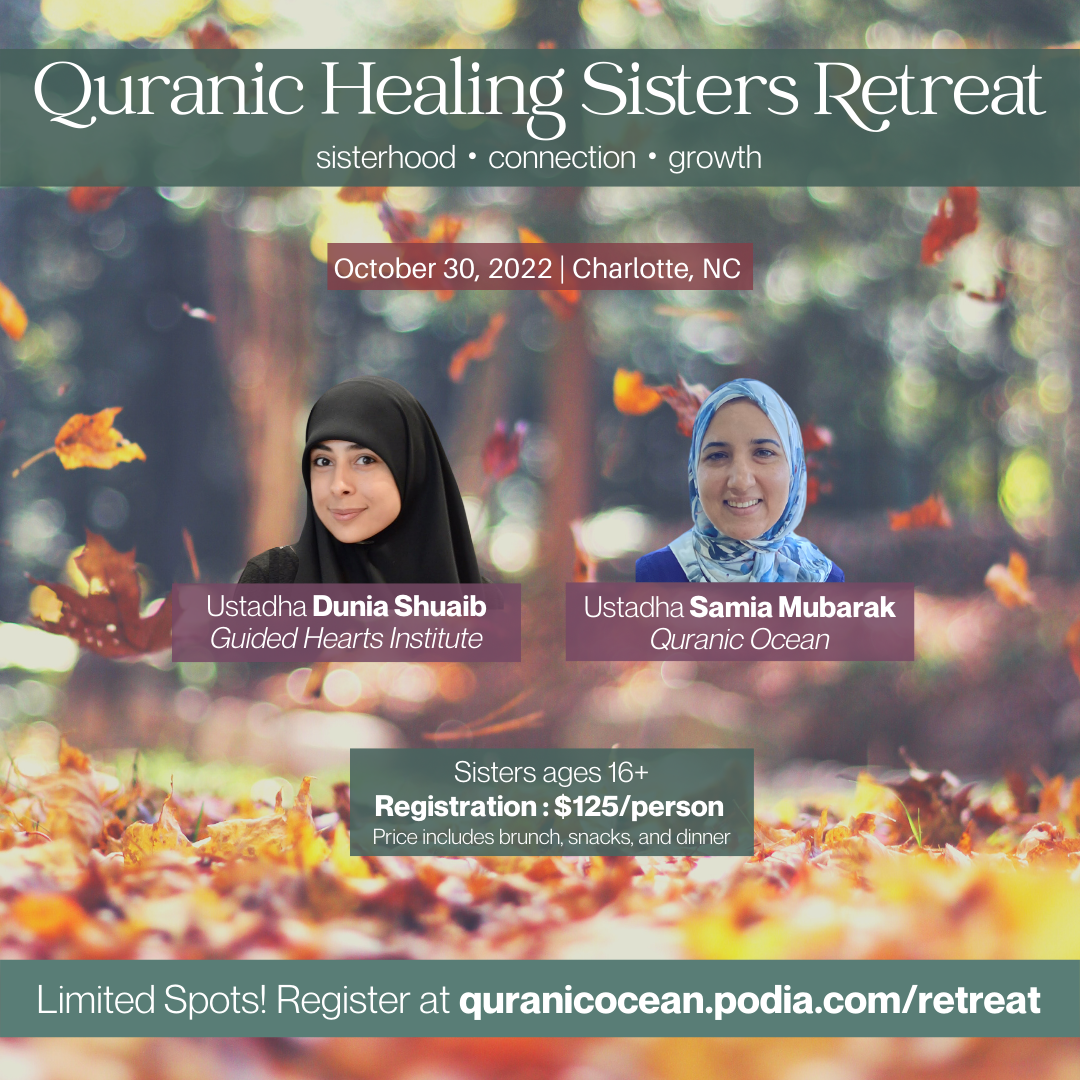 Join Ustadhas Dunia and Samia as they discuss the healing powers of the Quran to find inner peace in this life-changing retreat filled with sisterhood bonding, emotional healing, the remembrance of Allah ﷻ, fun activities, delicious foods, nasheed, duʿa, talk show, and more!